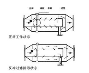 手 動蝶閥關閉,即閥板平面與筒體軸線垂直,(此時扳手旋轉90度與筒體軸線垂直),開啟排污閥,此時水流從進口進入過濾網筒前端,因蝶閥關閉,水流被閥板擋住,只能從前端網孔進入濾筒外側,大部分從出口流出,而由于排污口打開,濾筒后段水排出后壓力降低,故一部分水又從過濾器后段的網孔反沖入網筒內,從而達 到從濾網外部沖洗粘附在網筒內壁上雜質的目的,雜質及污水從排污口排出。