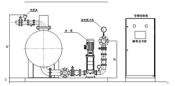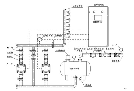 RWG系統智能型無負壓變頻供水設備是由穩流調節器、負壓抑制器、水泵機組、智能變頻控制柜、遠傳壓力表、各種閥門管件等組成。其原理圖如下所示。